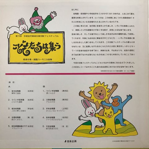 1981年12月9日、京都会館第1ホールにて行われた京都市の幼稚園児による演奏会「第11回 京都幼児器楽合奏交歓フェスティバル」の模様を収めたレコード。イントロのズレで一気に異次元に連れて行かれる「銀河鉄道999」、やたらノイジーな出だしから絶妙なカオスを作り出す「森のくまさん」、今アルバム一アヴァンギャルドな「通りゃんせ」などなど名演を収めてますが、このズレのスポンティニアスな感じは幼稚園児ならでは。幼稚園のレコード最高です!