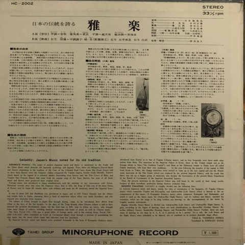 日本雅楽会による千数百年の悠久の歴史を持つ日本の伝統音楽、雅楽の演奏を収録した67年作。日本が誇る現代音楽家、武満徹をも魅了した笙の極彩色の倍音が創り出す極上のドローン・ミュージック。