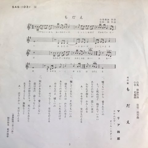 その癖のありすぎる歌唱法で知られる演歌歌手、マリア四郎の68年7インチ・シングル・レコード。B面「もだえ」が根本敬、湯浅学、船橋英雄による幻の名盤解放同盟からリリースされた「幻の名盤解放歌集 Columbia編 スナッキーで踊ろう」に収録。タイトル通りもだえるような歌声が強烈なカルト名曲です。