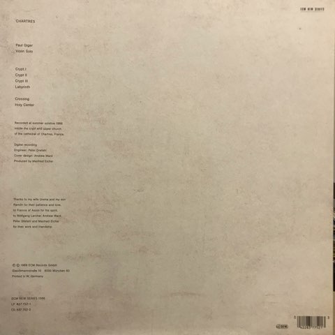 スイスのヴァイオリニストPaul GigerがECM New Seriesからリリースした89年作。パリのシャルトル大聖堂で録音されたという空間を感じさせるECMらしい音響を活かしたディープでメディテーティヴなヴァイオリン・ソロ作品。なかでも電子変調させたB2「Holy Center」が白眉。ジャケット汚れているみたいに見えますが模様です。