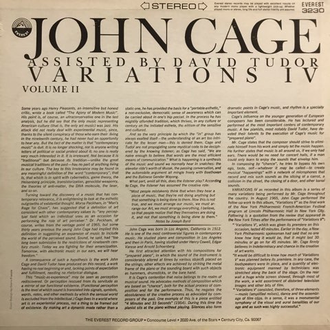 現代音楽作曲家John Cageと盟友David Tudorによる、何十台ものラジオや電気製品を用意し、そこから流れてくるしゃべりやベートーヴェンにポップス、ムードミュージックやノイズなどを即興でミックスしていくパフォーマンスを収めたライブ盤。偶然性を重視するチャンス・オペレーションによって関係のない音がランダムに並べられ、それぞれの音が持つ固有の意味を失い新たな音楽の一部として別の意味を持ち始めるコラージュのダイナミクスを味わえる傑作。