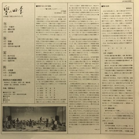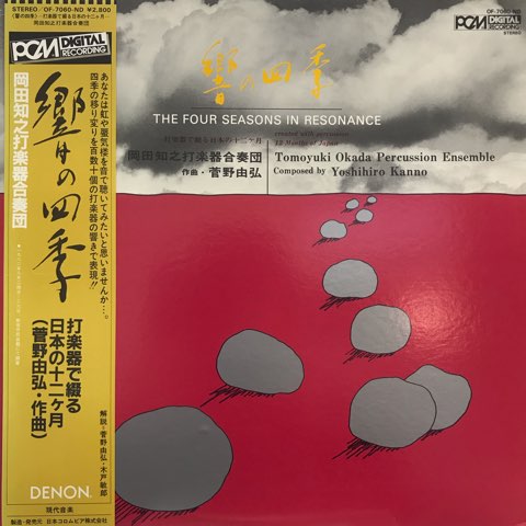 現代音楽家 菅野由弘による四季の移り変わりを音で表現したという楽曲を、異形の音響作品『天地聲聞』でも知られる岡田知之打楽器合奏団が演奏したアルバム。ヴィブラフォンやグロッケンシュピールといった透明感のある金属楽器からアフリカ、インド、キューバ、中国などの民俗楽器までを使用し残響の美しさも含めて色彩豊かに表現した珠玉の音響作品。素晴らしいです。