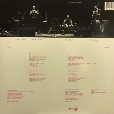 ギタリストRalph Towner、Don CherryらとのユニットCodonaでも知られるパーカッショニストCollin Walcott、リード奏者Paul McCandless、ベーシストGlen Mooreからなる4人組エスノ・ジャズ・グループOregonのECM第1作目となる83年作。Oregonが持つ従来の無国籍なエスノ・テイストに、Ralph Townerの今作から取り入れられたECM特有の幻想な音響処理が施されたニューエイジ的シンセサイザーが融和し完全にワン&オンリーの音世界を創り上げている傑作。ジャケットはイマイチすぎますが中身は相変わらず最高です。