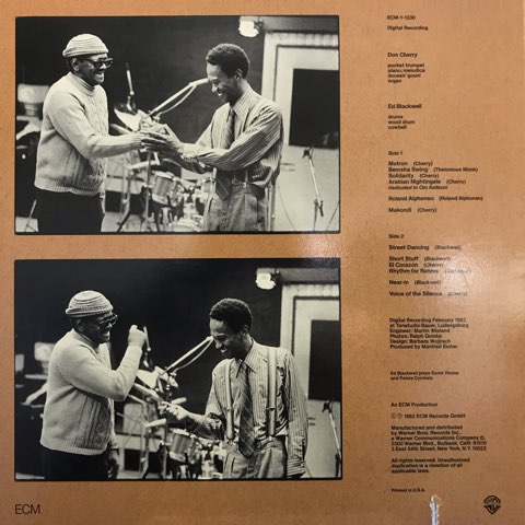Ornette Colemanとともに活動していた奇才トランペット奏者Don CherryとドラマーEd Blackwellが69年にデュオでフランスの先鋭的なジャズ・レーベルBYGに残した妄想民族音楽傑作「Mu」から13年後、再びデュオでECMに録音した82年作。Don Cherryはポケット・トランペット、ピアノ、メロディカ、西アフリカの弦楽器Doussn'Gouni、オルガン、Ed Blackwellはドラム、ウッド・ドラム、カウベルと多様な楽器を用いてオーガニックな音の対話を展開しています。ラストに収録されたDon Cherryのトランペット・ソロ「Voice Of The Silence」は残響音も含めてただただ美しいの一言。