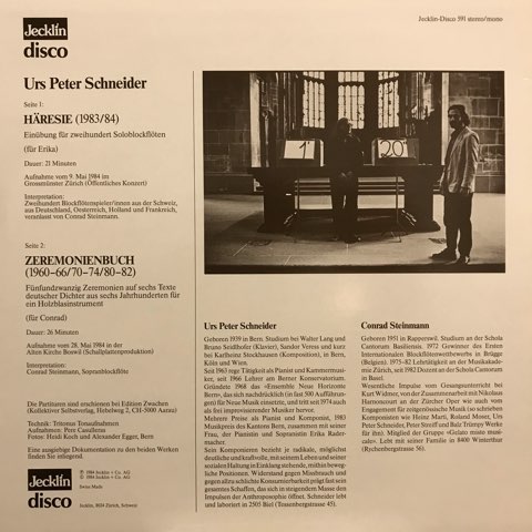 スイスの前衛作曲家/即興演奏家、ウルス・ペーター・シュナイダー作曲による、200人のリコーダー奏者のための楽曲「Haresie」を収録した1984年作。少人数の演奏から始まり、いつのまにかとてもリコーダーのみとは思えない分厚いドローンが渦巻いていく中盤〜後半は圧巻。個人的にはヘッドフォンで爆音で聴いた方が面白かったです。優秀録音盤としても有名。