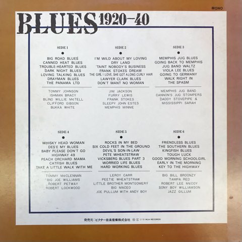 中村とうよう、日暮泰文、鈴木啓志監修による日本でしかリリースされていない3枚組の戦前ブルース大名盤。当店的にイチオシはギター、ヴォーカルともにエグすぎるTommy McClennan「Des'e My Blues」、Harry Smithの「Anthology Of American Folk Music」にも別曲が収録されたMemphis Jug Bandのジャグやカズーを使った「Jug Band Waltz」、Lonnie Johnsonの影響を受けたと思われる洗練されたコードワークのギターが素晴らしいClifford Gibson「Drayman Blues」など。戦前ブルースはユニークで強烈なものが多く本当に面白いです。