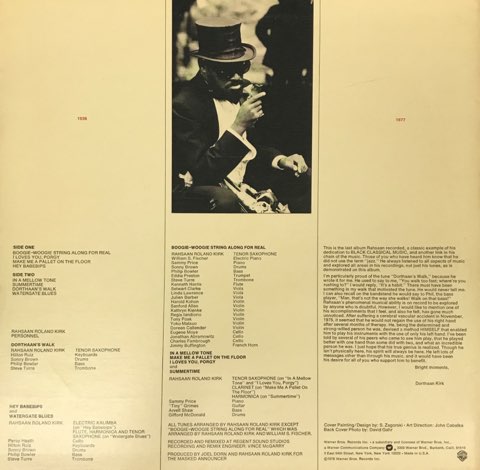 盲目の鬼才ジャズ・ミュージシャンRolan Kirkが脳卒中から奇跡的な回復後に半身不随ながら制作した78年の遺作となるアルバム。以前のように複数のリード楽器を同時に操るような鬼気迫る演奏は聴けませんが、リラックスしたムードの「Make Me A Pallet On The Floor」や「Watergate Blues」、テープ操作もされるオルゴールをバックにテナー/ハーモニカ・ソロが優しく響く「I Loves You, Porgy」「Summertime」、Kirkがカリンバを演奏する「Hey Babebips」など陽と哀のバランスが絶妙に入り混じったRoland Kirkの遺作に相応しい作品になっています。