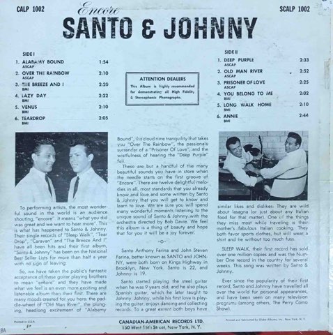 ブルックリンのイタリア系アメリカ人兄弟によるインスト・デュオSanto & Johnnyの60年1stアルバム。ジャケットにもデカデカと載っている、Santoによる独特のエコーの効いたトロトロのスティール・ギターがたまりません!Martin Dennyなどのエキゾ好きにも最高のここではないどこかに連れていってくれる名作!