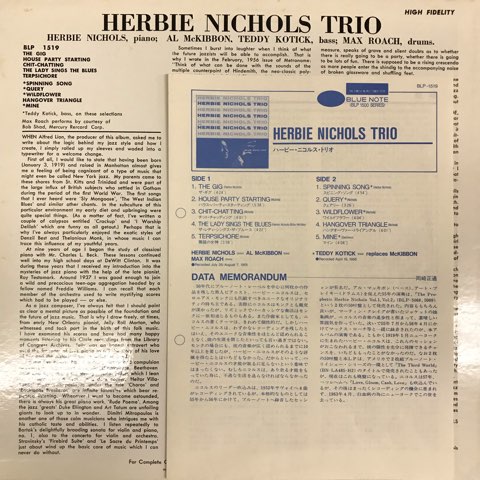Thelonius Monkと並ぶ、あるいはそれ以上に個性的なジャズ・ピアニストHerbie Nicholsが名門Blue Noteからリリースした56年作。自身の作曲になる変わった楽曲構造や、うねうねしたメロディー、独特の間合いにつんのめるリズム、つかみどころのないハーモニー、そしてかなりヘンテコなタイトルなど全部が全部強烈にユニーク!!アヴァンギャルド系ジャズ・ミュージシャンへの影響も絶大!