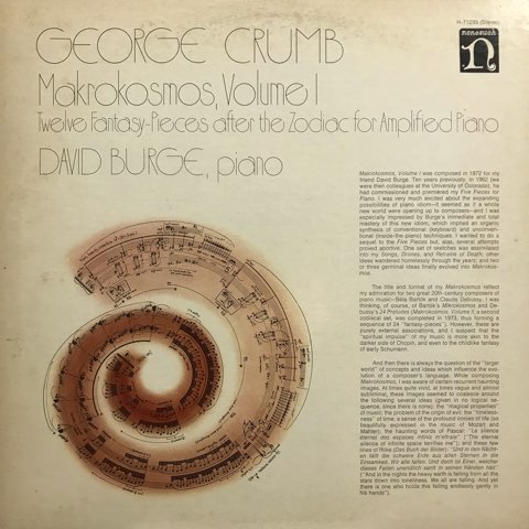 徹底的な音色の探究や特殊奏法の開発で知られるUS前衛作曲家George CrumbがピアニストDavid Burgeのために作曲したアンプリファイド・ピアノのための「Makrokosmos Volume I」。様々な特殊奏法によってイマジネーション溢れる豊かで多彩な音色をピアノから引き出した音響宇宙作品。