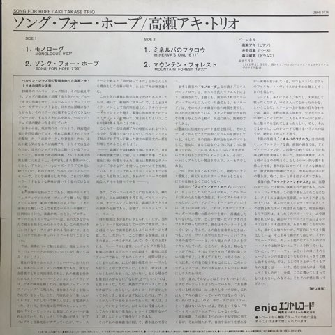 ジャズ・ピアニスト高瀬アキがエンヤ・レーベルのオーナーHorst Weberの招待により井野信義と森山威男とのトリオでベルリン・ジャズ祭に初出演した時の82年ライブ音源。Pharoah Sandersの「Love Is Everywhere」にインスパイアされたという「Song For Hope」はジャパニーズ・スピリチュアル・ジャズ史に残る大名曲!メランコリックな「Minerva's Owl」も◎