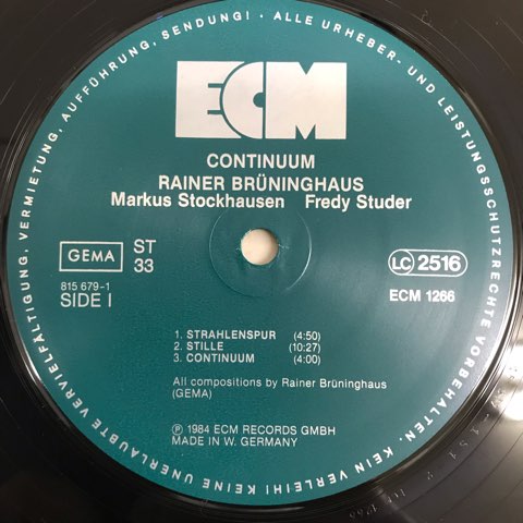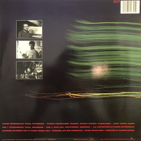 ドイツ異能ベーシストEberhard Weberの盟友としても知られるキーボーディストRainer BruninghausがトランペッターのMarkus StockhausenとドラマーのFredy Studerによるベースレスの変則トリオ編成でECMからリリースした84年作。イントロから最高のミニマル・ジャズ「Strahlenspur」、メディテーティヴな「Stille」などRainer Bruninghausの多重録音も駆使したシンセがヤバいです!