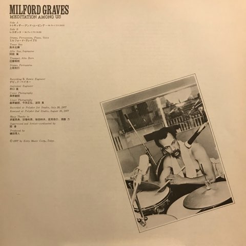フリー・ジャズ・ドラマーMilford Gravesが評論家の間章とMilford Gravesに師事したパーカッショニスト土取利行の招きで来日した折に、阿部薫、高木元輝、近藤等則、土取利行という強烈なメンツと録音した77年の日本オンリー盤。Milford Gravesのポリリズミックでダイナミックなドラムを軸にフリーキーな音が入り乱れるA面、貴重なMilford Gravesのピアノも聴けるスピリチュアルな響きに満ちたB面と両面素晴らしいフリージャズ・クラシック!爆音で!!
