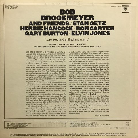 ジャズ・トロンボーン奏者Bob Brookmeyerの65年作。Stan Getz、Herbie Hancock、Elvin Jones、Ron Carter、Gary Burtonがバックに参加。1曲目Gary Burtonのヴィブラフォンも爽やかに響く、休日の朝に聴けたらサイコーな「Jive Hoot」はじめリラックスした演奏が心地よい極上盤。