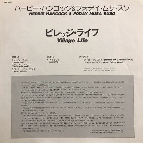 ジャズ・ピアニストHerbie Hancockと西アフリカ・ガンビア出身のグリオと呼ばれる階層の音楽家Foday Musa Susoが共同制作した85年作。Herbie Hancockの浮遊感のあるシンセサイザーとFoday Musa Susoによる西アフリカの伝統撥弦楽器「コラ」の美しい響きが共鳴した極上エスノ・ジャズ。