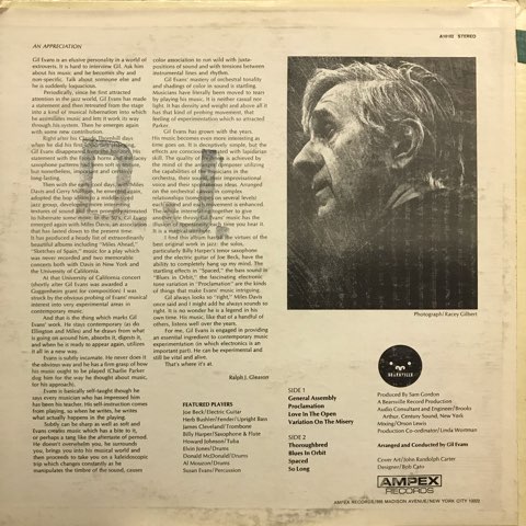 最高傑作「The Individualism Of Gil Evans」制作後、子育てによりほぼ活動停止だった65年〜69年を経て活動を再開した69年〜70年のセッションから制作され1971年にAMPEXからセルフ・タイトルでリリースされた通称「アンペックス・アルバム」。60年代半ば〜後半のフリージャズやロックの台頭を反映しエレキ・ギター、エレキ・ベースを導入したエレクトリック・ギル・エヴァンスの幕開けとなる記念すべき一枚。冒頭のMiles Davisとの共作「General Assembly」、Joe Beckのブルース・ギターが印象的なGeorge Russellの奇曲「Blues In The Orbit」、激ヤバ音響宇宙作品「Spaced」、ギル・エヴァンス・ハーモニーをバックにBilly Harperのテナーが美しく響く「So Long」など名曲だらけの傑作。