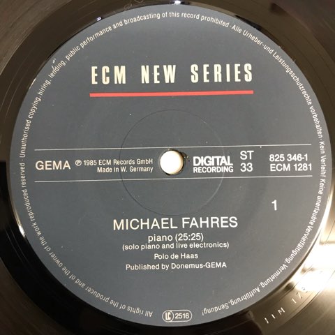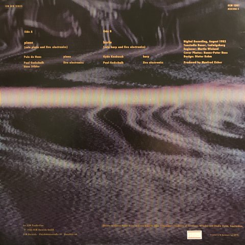 ECMが80年代に立ち上げた新レーベル『ECM NEW SERIES』第4弾となるピアニスト/作曲家/プロデューサーMichael Fahresのデビュー盤。A面にPolo de Haasのピアノ・ソロ、B面にGyde Knebuschのハープ・ソロを収録、そしてPaul Godschalkがそれぞれの生楽器の倍音をリアル・タイムで電子制御しスピーカーから同時に流し録音した異色の作品。アコースティックとエレクトロニクスが融合しためっちゃディープなミニマル音響作品に仕上がっています。