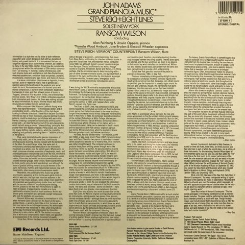 ミニマル・ミュージック最重要人物の一人Steve Reichの「Eight Lines」、「Vermont Counterpoint」と、ポスト・ミニマリストJohn Adamsの「Grand Pianola Music」をRansom Wilsonコンダクトにより録音した85年作。ECMの80年作に収録の「Octet」を改訂した「Eight Lines」は様々な楽器の短いフレーズが繰り返しながら少しずつ姿かたちを変え展開していくReichらしい名曲!John Adams「Grand Pianola Music」はReichの影響を昇華しダイナミックな変化も取り入れた作品。Reichの「Eight Lines」がアナログで聴けるのはコレだけ!