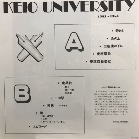 慶應義塾大学の1985年大学卒業記念アルバム。A面に歌を、B面に早慶戦や三田祭、授業や街中のフィールドレコーディングなどを収録。そのB面にラーメン二郎のフィルレコが入ってます。二郎好きの方いかがですか笑。