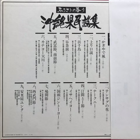 ポリドールから恐らく70年代にリリースされた沖縄民謡集。箏も入った編成の曲が大半を占めますが、中でもB2,3,4,5で聴けるアンビエンス成分を多分に含んだ多和田スミの箏が本当に素晴らしい!ほかにも「かぎやで風」、「谷茶前」、「安里屋ユンタ」など選曲も抜群です。名盤!
