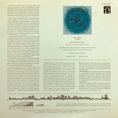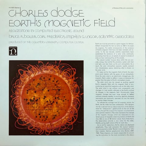コロンビア大学コンピューターセンターのディレクターを務めていたCharles Dodgeが米名門Nonesuchからリリースした70年作。各磁気天文台から得られる地球の磁場テータをグラフにし、音声合成プログラミングを使用してコンピューターに電子サウンドを再生させたというシロモノ。不思議な浮遊感がクセになる宇宙音響作品。