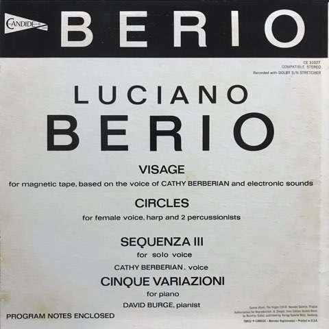 ÅŻҲ»³Ú¤ÎÀè¶î¼Ô¤Î1¿Í¤Ç¥¤¥¿¥ê¥¢¤ÎÁ°±Òºî¶Ê²ÈLuciano Berio¤¬60ǯÂå¤Ëºî¶Ê¤·¤¿ºîÉʤò½¸¤á¤¿ÊÔ½¸Èס£¤¹¤Ù¤ÆÀ¼³Ú²È¤ÇºÊ¤ÎCathy Berberian¤Î¤¿¤á¤Ë½ñ¤«¤ì¤¿¤â¤Î¤Ç¡¢ÅŻҲ»¤È¤Þ¤ë¤Ç¾ð½ïÉÔ°ÂÄê¤Î¤è¤¦¤ÊCathy Berberian¤Î¥ô¥©¥¤¥¹¤¬¸òºø¤¹¤ëÅŻҲ»³Ú¸Åŵ¡ÖVisage¡×¤ò¼ýÏ¿¤·¤¿Berio¤ÎÂåɽºî¤Î¤Ò¤È¤Ä¡£