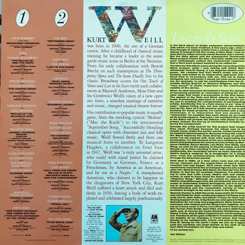 2020年にコロナで惜しくも亡くなった大音楽プロデューサーHal Willnerがドイツの作曲家Kurt Weillに捧げた、Nino Rota、Thelonius Monkに続くトリビュート・アルバム第3弾。Van Dyke Parks、John Zorn、Lou Reed、Carla Bley、Dagmer Krause、Todd Rundgrenなどの個性的なメンバーによる素晴らしいカバーを収録した一連のトリビュート作品の中でも最高傑作に挙げられる1枚。夢の中にいるようなオーケストレーションのVan Dyke Parks、日本語のセリフやコラージュも使った前衛的なJohn Zorn、ほぼ自作曲のようにハマりすぎのLou Reedが当店的にオススメです。