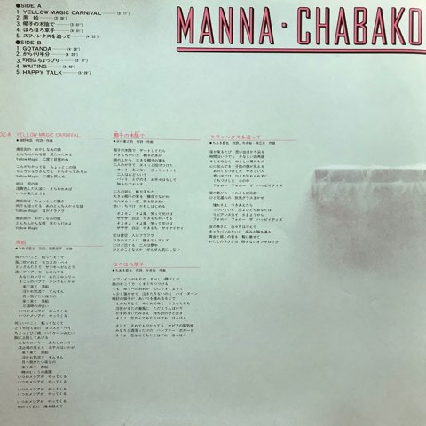 ティン・パン・アレイのセカンドアルバムにも参加していたシンガー、マナが林立夫のプロデュースで録音した79年1stアルバム。細野晴臣作曲のティン・パン・アレイ「Yellow Magic Carnival」カバーや筒美京平、浜口庫之介などから提供された楽曲を収録していますが、何と言っても素晴らしいのがサディスティックスのベーシスト今井裕による、77年の自身の傑作「A Cool Evening」にも通じるトロピカルでメロウ、そして適度にファンキーなサウンド・アレンジメント。スティール・パン、エレピが気持ちよすぎます!和モノ人気盤。