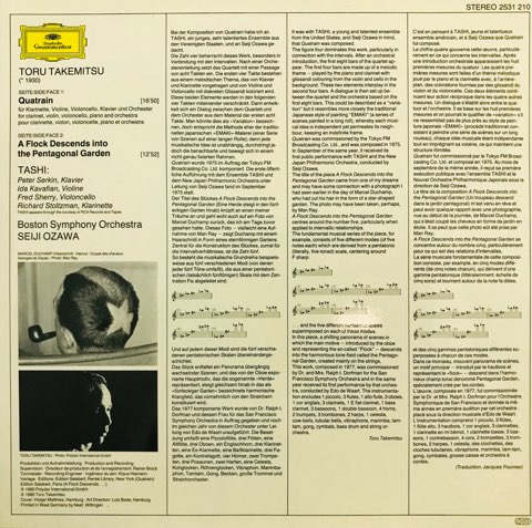 日本が誇る現代音楽家、武満徹が75年に作曲した「カトレーン」と77年に作曲した「鳥は星の庭に降りる」を収録した80年作。中でも「鳥は星の庭に降りる」は、イントロの極上のハーモニーから「響き」を重視する武満らしさが前面に出た代表曲のひとつ。ラストのアンビエントな余韻もヤバすぎる。これは音の良いドイツ盤で!