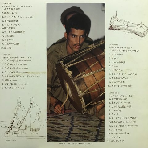 日本が誇る民族音楽学者、小泉文夫監修が日本民族文化の源流を辿るべく、モンゴル、ネパール、ウズベク共和国(現ウズベキスタン)、パキスタン、インドといったシルクロード周辺の国々を訪れその地域の民族音楽を現地収録したレコード。まるでアルゼンチン音響派の奇才Mono Fontanaの2007年傑作「Cribas」のバックに流れていてもおかしくないような、水音に雑踏、ドローンのようなホラ貝からミステリアスなモンゴルのハルハ民謡に繋がる冒頭や、インドのラマ教寺院の僧侶による長いラッパ、トーンチンのえげつない音、同じくインドの双菅楽器ンギブリオ・パリットの不思議なハーモニーなどユニークな独自音楽の数々をずらり収録。