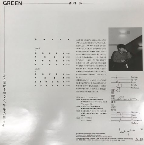 現在世界から再評価されている日本の環境音楽家/音響デザイナーの先駆者、吉村弘の86年作。この吉村弘ならではのシンセサイザーの音色・旋律はもはや魔法レベルの心地よさ!Greenというタイトルは色のイメージではなく語感の響きから来ているそうですが、それでも夏の終わりの田園風景とともに聴くと泣きそうなほどにハマります。オリジナルは吉村作品の中でもトップクラスのレア度です。