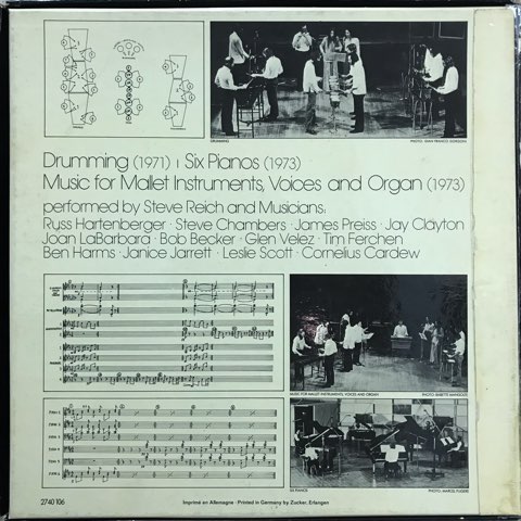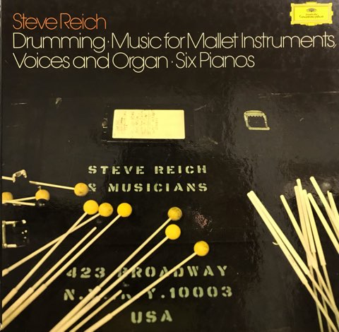 ミニマル・ミュージックを代表する前衛音楽家Steve Reichがドイツ・グラモフォンから74年にリリースしたLP3枚組BOX。1枚目2枚目には「Drumming」を、3枚目に「Six Pianos」「Music For Mallet Instruments, Voices And Organ」を収録。ポリリズミックでプリミティヴな打楽器によるA面、柔らかなマリンバと女声が極上の時間を提供してくれるB面、グロッケンシュピールが細やかな音響空間を形作るC面、これまでの楽器をすべて使いトリッピーに展開していくD面からなる「Drumming」、E面の6台のピアノが絡み合いながら少しづつ姿かたちを変え展開していくサイケデリックな「Six Pianos」、後の代表曲「Music For 18 Musicians」に発展していくような「Music For Mallet Instruments, Voices And Organ」と全曲本当に名曲です。100分超の至福の時間を味わえる大傑作!