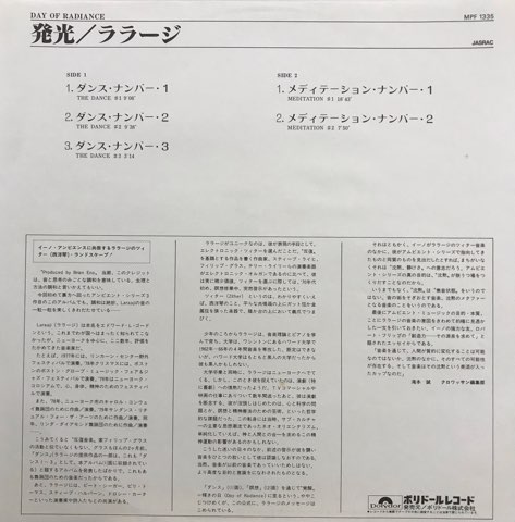 アメリカ人ツィター奏者LaraajiがBrian Enoプロデュースでリリースしたアンビエント・シリーズの第三弾となる80年作。ミニマルに響くツィターが桃源郷へと誘うA面「The Dance 」、タイトル通り瞑想的に浮遊するB面「Meditation」の二部構成からなるニューエイジ・アンビエント大傑作。両面とも昇天必至の極上盤!