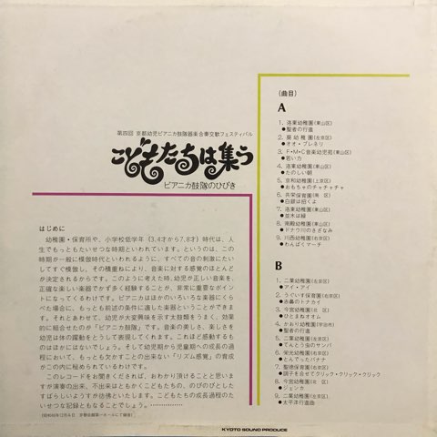 1974年12月4日、京都会館第1ホールにて行われた京都市の幼稚園児による演奏会「第4回 京都幼児ピアニカ鼓隊 器楽合奏交歓フェスティバル」の模様を収めたレコード。好事家にはたまらない絶妙にカオスな演奏を多数収録しています。The Shaggs、Maher Shalal Hash Baz、The Portsmouth Sinfonia、49 Ameriacansなんかが好きな人に是非!
