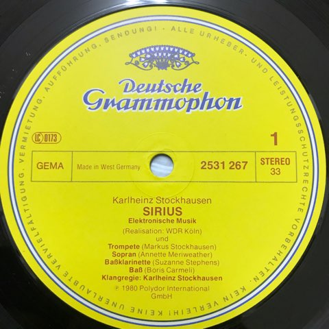 ドイツを代表する現代音楽家Karlheinz Stockhausenが1975年から1977年にかけて作曲した電子音楽とバスクラリネット、トランペットと声楽による宇宙を舞台にした2枚組96分の超大作音楽劇「Sirius」。爆音でスピーカーの目の前で聴くと音が見えそうなほどの音質の良さ!特にA面とD面の電子音楽の部分の音響体験は凄まじすぎます!