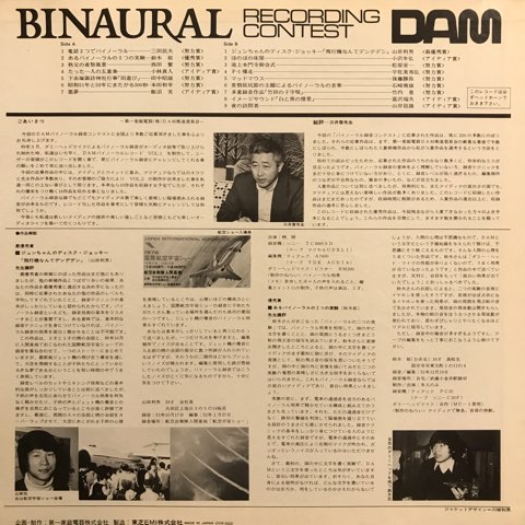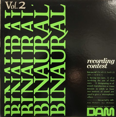 DAM(第一家庭電器株式会社)企画制作による、リアル音響バイノーラルで録音された音源を一般の人から募集して作られたレコード「バイノーラル録音コンテスト」。定番のフィールドレコーディングものも多数ありますが、宅禄の演奏に面白いものが多いです。なかでも一人五役で多重録音した「たった一人の五重奏」、常盤炭坑節を素材にリズムボックスも用いてミニマルに宅禄したナレーション入りの「常盤炭坑節の主題によるバイノーラルの音楽」、フォーキーな演奏にヤバイシンセやフィールドレコーディングも入ったアシッドな「イメージサウンド 白と黒の情景」なんかの個人の宇宙が溢れ出た感じはアマチュアならでは!最高です。ほかにもバイノーラルを有効に使いストーリー仕立てに展開していくタイトルだけで興味を惹かれる「悪夢」「夜の訪問者」なども。
