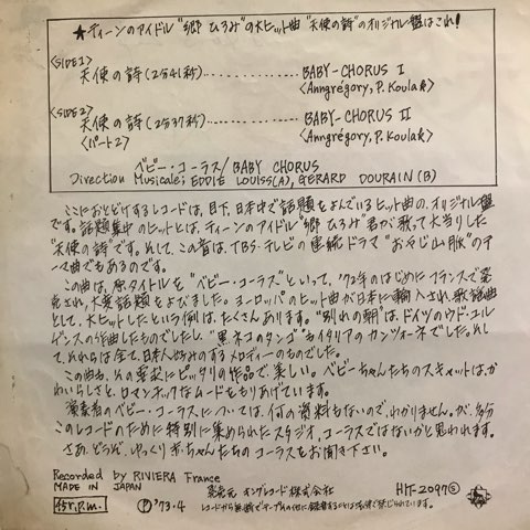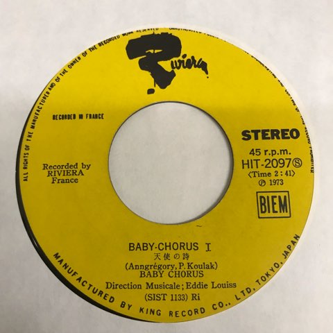 郷ひろみ「天使の詩」の元ネタでもある、Eddie Louiss, Gerard Dourian作「Baby-Chorus」というタイトルの7インチ・シングル・レコードを日本盤で73年に「天使の詩」としてリリースした一枚。異様にカッコいいブレイクにひたすら少女のコーラスが続くなんだか良く分からないシロモノ。この日本盤の情報は全然出てきません。