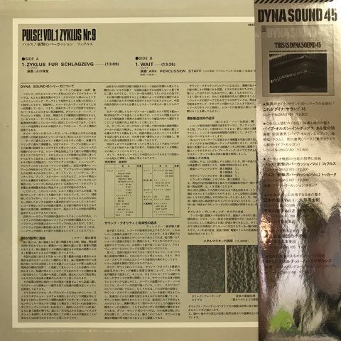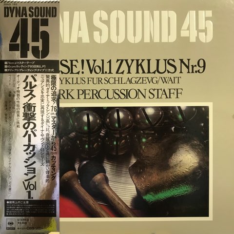 A面に日本フィルハーモニーのパーカッショニスト、山口保宣のソロ打楽器によるStockhausenの「Zyklus」を、B面にその山口と、一柳慧と小杉武久とともに録音した鬼レア盤「Improvisation, SEP. 1975」で知られる米国のパーカッショニストMichael Rantaほか計5名からなるArk Percussion Staffによる近藤譲作曲の「Wait」を収めた77年作。B面の「Wait」はヘッドフォンで爆音で聴くと頭の中でカウベルの余韻まで美しい高音がコロコロ転がる快感や、ティンパニーやボンゴなどの低音に四方八方から脳みそをシバかれるような気持ちよさが味わえる打楽器音響作品です。