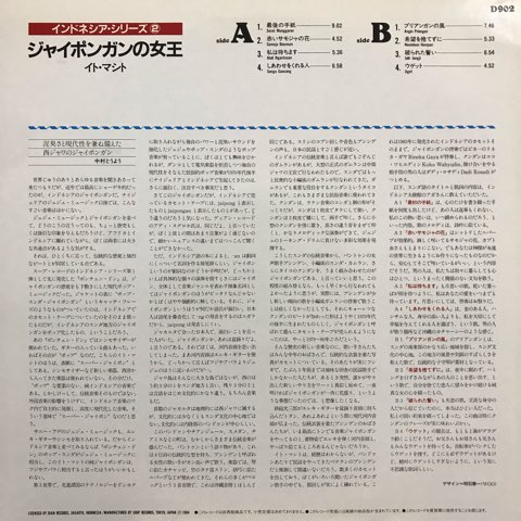 インドネシア・スンダ地方の伝統的な小編成ガムランと、プシンデンと呼ばれるガムラン合奏における女性歌手に、タイコのクンダンが加わり70年代後半に誕生したジャイポンガンを収録したアルバム。83年にインドネシアでリリースされたカセットテープを84年に中村とうよう企画によって日本でアナログ化した一枚。哀愁のガムランとエキゾチックなItoh Masyitohの歌に切り込んでくる、グンダンのビートのエグさと異物感が強烈すぎ!