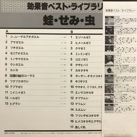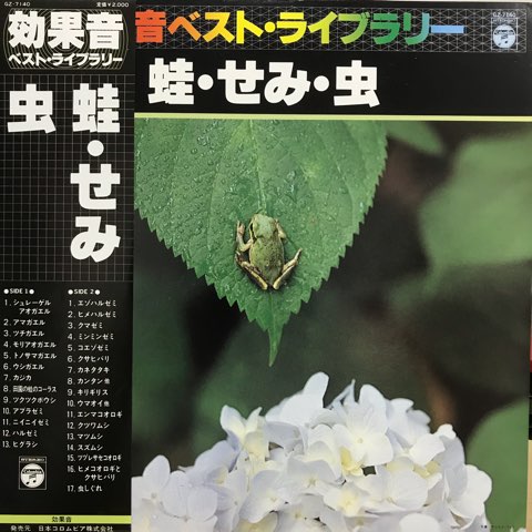 コロムビアのフィールド・レコーディング・シリーズ『効果音ベスト・ライブラリー』からの一枚でカエルやセミ、コオロギ、スズムシなど梅雨から秋にかけての虫の鳴き声を収録したレコード。ほぼ電子音の「ニイニイゼミ」、フリー・インプロヴィゼーションで出てきそうな「モリアオガエル」、ミニマル・ミュージック「田園の蛙のコーラス」など面白い音入ってます。アンビエントを通過した耳では日常での自然音も意識すれば音楽的に聴こえますが、「きちんと録音された環境音をあえてレコードで家で聴く」という行為はさらに自然音から音楽的な部分を抽出することができ、そしてそれをまた日常に循環できるという効果があります。蛙のインプロ/ミニマルから始まりセミのノイズを通過して秋の昆虫のチルアウトで終わる構成も秀逸!フィールド・レコーディングもの名盤。