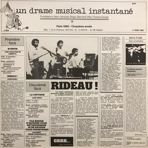 フランスの前衛マルチ・アーティストJean-Jacques BirgeとFrancis Gorge、Bernard Vitetによる前衛グループUn Drame Musical Instantaneが自主レーベルGRRRからリリースした80年作。ジャズ/フリー・インプロヴィゼイションを基本に奇妙な音のコラージュやエグイ電子音がミックスされたエクスペリメンタル作品。内容最高です!