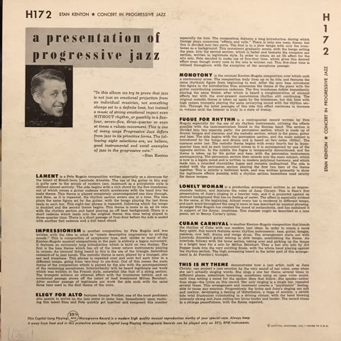 1920年代から音楽活動を始め、ラージ・アンサンブルのリーダーとして実験を重ね革新的なオーケストレーションを創り上げていったStan Kentonの48年作。自らの音楽を表す言葉「プログレッシヴ・ジャズ」をタイトルに冠した、不穏で奇妙なワン&オンリーのサウンドが聴ける激ヤバ盤。アレンジャーのPete Rugoloともどもやはり変態!マジでカッコいいです!
