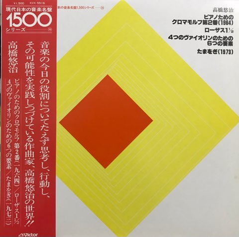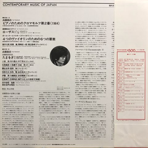 日本を代表する現代音楽家/作曲家/ピアニストの高橋悠治作曲による4作品を収めた『現代日本の音楽名盤1500』シリーズからの一枚。電子音/ドローンのような音色やパーカッシブな奏法、師事していたIannis Xenakisの影響を感じさせる幾何学的な響きまで様々なヴァイオリンの可能性を引き出した「ローザス 1 1/2」と「6つの要素」、こちらもXenakis的なオーケストレーションに日本的混声合唱を取り入れた「たまをぎ」と高橋悠治の個性が色濃くでた楽曲を収録しています。