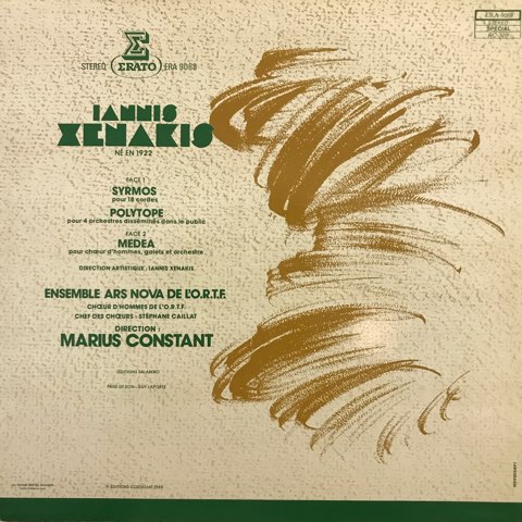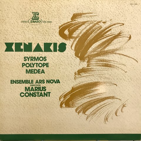 フランスが誇る現代音楽作曲家で建築家でもあるIannis Xenakisのオリジナルは71年に仏Eratoからリリースされた、18弦楽のための「Syrmos 」、管弦楽曲「Polytope」、声楽と管弦楽のための「Medea」を収録した一枚。特にA面に収録された59年作曲の「Syrmos 」と67年カナダ・モントリール万博でのXenakisが担当した彫刻・ライトショー・音楽によるインスタレーションのために作曲された「Polytope」は、とても生楽器だけとは思えない電子的な響きすら感じさせる凄まじいオーケストレーションによって幾何学模様の音世界に放り込まれるような、Xenakisでしかありえない音響体験ができる傑作です。強烈!