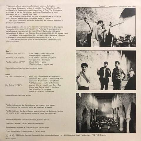 フリー・ミュージック名門レーベルIncusから81年にリリースされた、第5回ピサ・ジャズ国際ラッセニャでの即興シンポジウム・プロジェクトの模様を録音した一枚。Derek Bailey、Evan Parker、George Lewisなど総勢10名のインプロヴァイザーがデュオやクインテットで即興演奏を展開。様々な奇妙な音が入り乱れるインプロ名作。