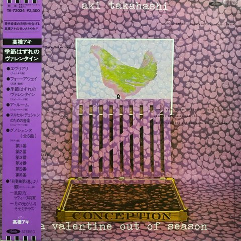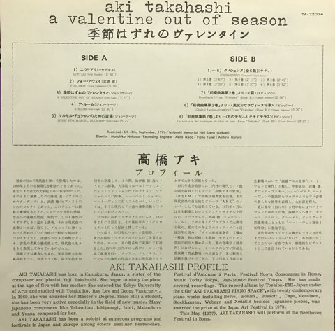 その清澄な音色や明晰なタッチで知られる現代音楽ピアニスト、高橋アキの77年作。Ianis Xenakis、武満徹、John Cageの前衛作曲家のほかErik SatieとClaude Debussyも取り上げたアルバム。全曲素晴らしいですが個人的にはJohn Cage作曲によるプリペアド・ピアノのための3曲「季節外れのヴァレンタイン」、「ア・ムール」、「マルセル・デュシャンのための音楽」がダントツ!Sun Raのモーグ・ソロにも通じる独特の浮遊感にヤラれます。あと「季節外れのヴァレンタイン」っていうタイトルもカッコいい!