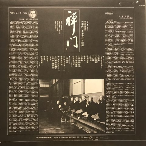福井県にある曹洞宗の仏教寺院、曹洞宗大本山永平寺にて僧たちの日常生活をフィールドレコーディングした一枚。早朝の鈴の音「振鈴」、あまりにも長い余韻が響き渡る「大梵鐘」、倍音を含んだ鐘と淡々としたビートに大人数での読経がもはやサイケデリックな「般若心経」、水の音と鈴の音、生活音で締めるラストの「開枕鈴」など収録した、激ヤバ・ディープ・ジャパニーズ・アンビエント作品。