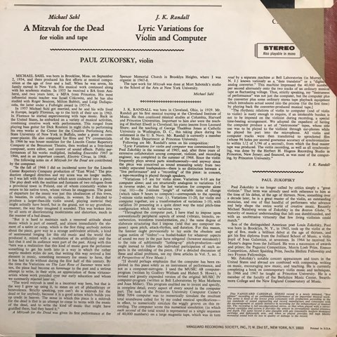 NYの作曲家Michael Sahlのヴァイオリンとテープのための「A Mitzvah For The Dead For Violin And Tape」をA面に、ニュージャージーの作曲家J.K. Randallのヴァイオリンとコンピューターのための「Lyric Variations For Violin And Computer」をB面に収録した68年作。ヴァイオリンはPaul Zukofsky。ヴァイオリンとテープ/電子音による音響宇宙作品。テープ・コラージュのA3「Third Movement (All Electronic)」も◎。