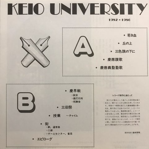 慶應義塾大学の1985年大学卒業記念アルバム。A面に歌を、B面に早慶戦や三田祭、授業や街中のフィールドレコーディングなどを収録。そのB面にラーメン二郎のフィルレコが入ってます。二郎好きの方いかがですか笑。