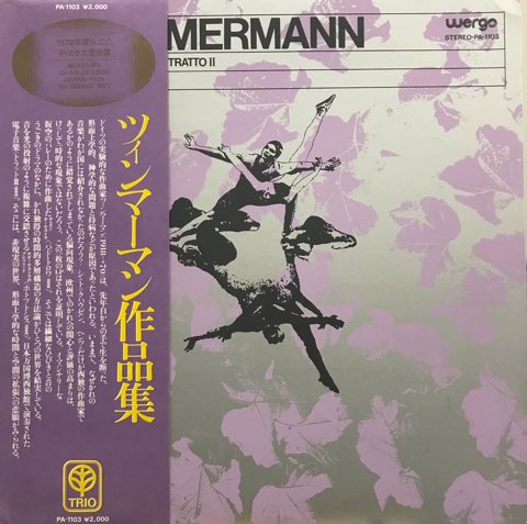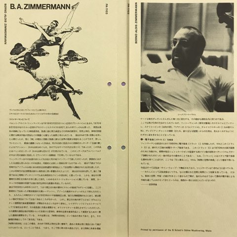 1918年ドイツ生まれの現代音楽家B.A. Zimmermannの死後Wergoからリリースされた72年作。A面を占める、マンドリン、エレクトリック・ギター、ダルシマー、ミュージカル・グラス、ハープ、ピアノ、打楽器による不協和な響きの「Pas De Trois」、凄まじいトーン・クラスターが迫ってくる「Photoptosis」、大阪万博のために作曲された電子音響作品「Tratto II」の3曲を収録。杉浦康平デザインのシルクスクリーン・プリントによる日本独自ジャケも素晴らしいです。